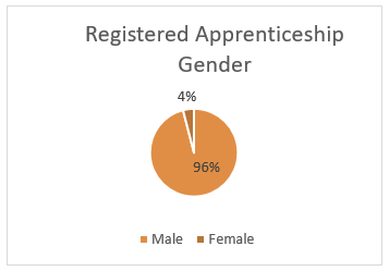Ninety-six percent (96%) of the 2012-2013 Registered Apprenticeship program completers were men (Chart 4). The few women Registered Apprentices (36) were represented in only 8 of the 27 occupations in which 2012-2013 Registered Apprenticeship completers are working.