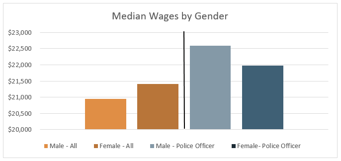 Female Registered Apprentices with full-quarter wages have a median quarterly wage of $21,061, which is higher than the median quarterly wage of $20,681 for male Registered Apprentices. However, this is a limited comparison since there are so few female Registered Apprentices and they only overlap with male Registered Apprentices in a handful of occupations. Therefore a comparison of the median quarterly wages of Registered Apprenticeship completers working as police officers is instructive, because of the number and proportion of female Registered Apprentices entering this occupation. See Chart 5.The male police officers with full-quarter wages have a median quarterly wage of $22,590 compared to $21,784 for female police officers. That $806 quarterly wage difference translates to over $3,200 annually or $260 per month.