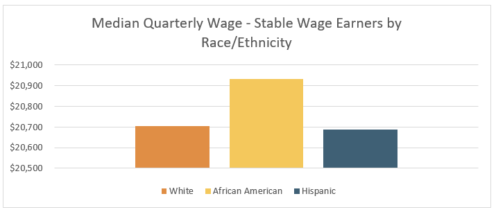 The median quarterly wage for African Americans is $230 per quarter higher than Whites and $245 higher than Hispanic Registered Apprenticeship completers with full-quarter wages. See Chart 9. Once again, the wage differences can be partly explained by the fact that 34% of African-American Registered Apprenticeship completers with full-quarter wages completed a Police Officer Registered Apprenticeship program versus 10% of all White Registered Apprenticeship completers with full-quarter wages. Police Officer Registered Apprenticeship program completers report the highest median quarterly wages among Registered Apprenticeship completers.
