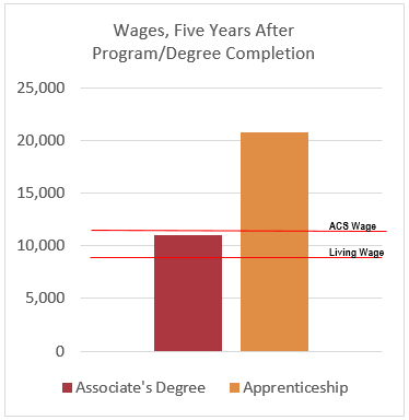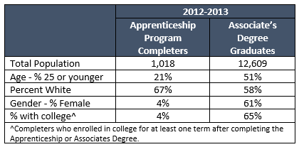 small and distinct population. There are only 1,019 apprenticeship completers in this cohort, of which two-thirds are White, 96% are men, and the average age at program completion is 31. In comparison, as demonstrated in Table 1 below, the Associate Degree Graduates are younger, and more diverse. Further, apprenticeship programs are restricted to training for occupations that require highly technical skills or specific industry credentials. Comparatively, Associate’s Degree programs prepare graduates for a wider range of career options, some are highly technical and may command a wage premium while others prepare graduates for entry-level positions which may result in wage growth over time.